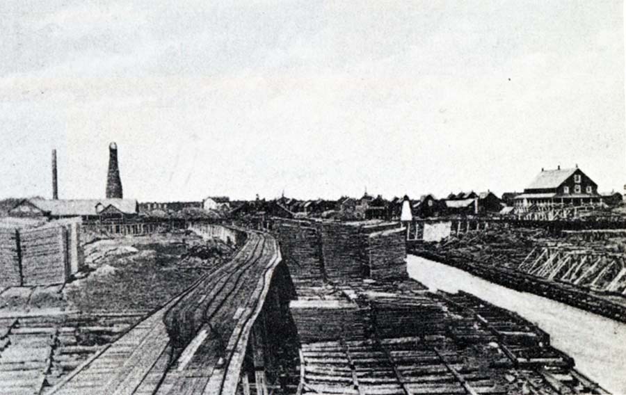 The mill tramway with lumber piles on both sides